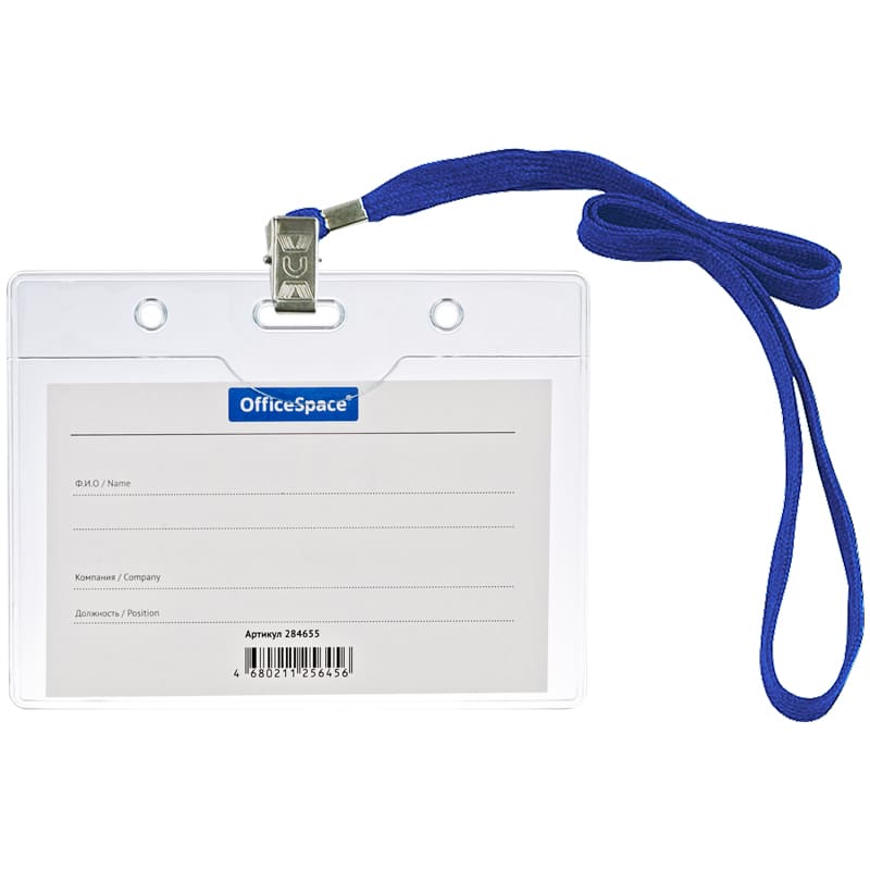 Бейдж горизонтальный, 'OfficeSpace', 100x75 мм, с клипом на синем шнурке, 284655