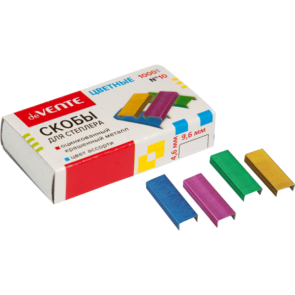 —Скобы для степлера цветные 'deVENTE' №10, 4 цвета ассорти, 1000 шт в картонной коробке, 4141900