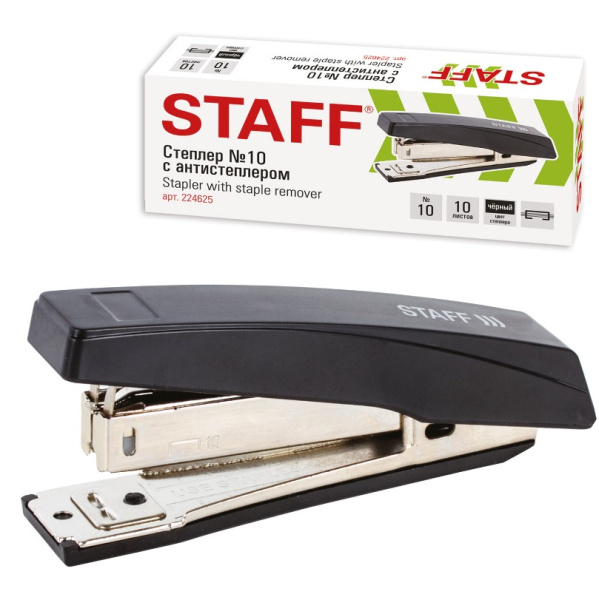 —Степлер №10 STAFF 'Basic', до 10 листов, с антистеплером, черный, 224625
