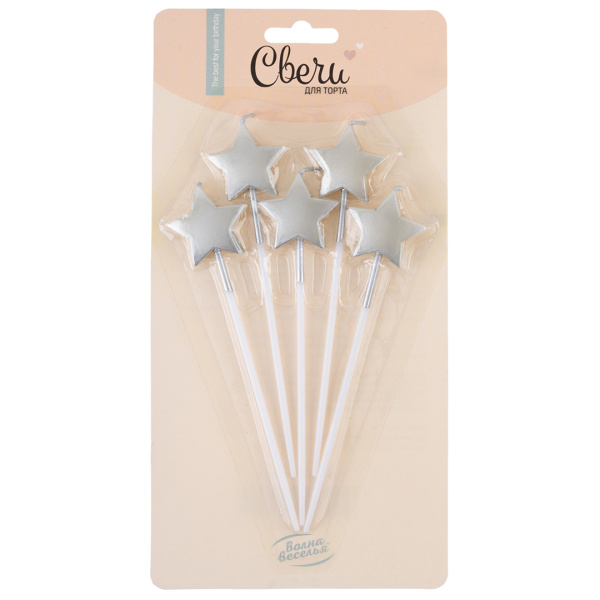 —Свечи Звезда, на шпажке, Серебро, Металлик, 3~3 + 12 см, 5 шт. с держат., 802952S