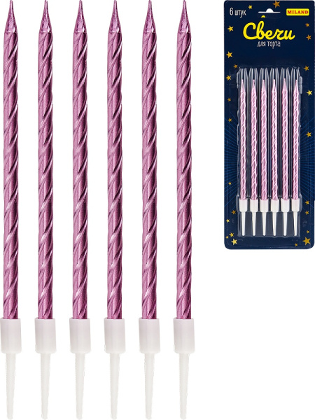 —Свечи для торта на подставке 'Веселье', 0,4х10,5 + 3 см, (6 шт), розовые, С-2031