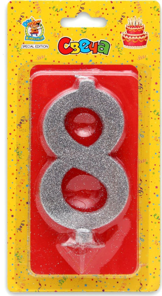 —Свеча для торта 'Цифра 8. Серебряный глитер' Миленд, картон. уп., европодвес, С-1890