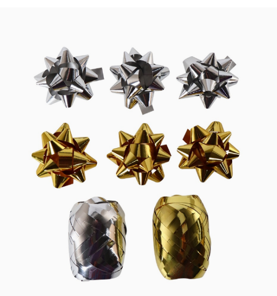 —Набор для оформления подарков Золото и серебро матовый, 6 бантов + 2 ленты 5 мм х 10 м, БЛ-0385
